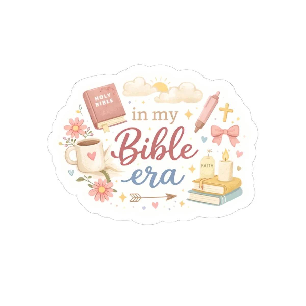A cheerful, faith-forward vinyl sticker that brings gentle warmth to whatever it touches. Soft pastels, hand-drawn icons (bible, candle, mug, flowers), and the playful script “in my Bible era” create a cozy, devotional vibe that feels like a quiet morning of journaling and prayer. It clings smoothly to laptops, journals, water-resistant-free surfaces, or any flat spot that needs a little spiritual encouragement. The glossy finish makes colors pop while resisting light scratches, and the kiss-cut shape follows the artwork’s silhouette for a clean, professional look.
